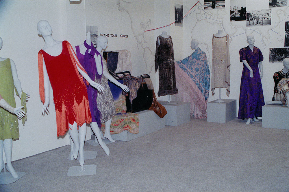 Photograph of "Grand Tour" exhibit installation held in Gustafson Gallery from September 26 to December 10, 1991. Several garments are displayed on mannequins and on a trunk. Text on the wall says "Grand Tour 1923-1924."