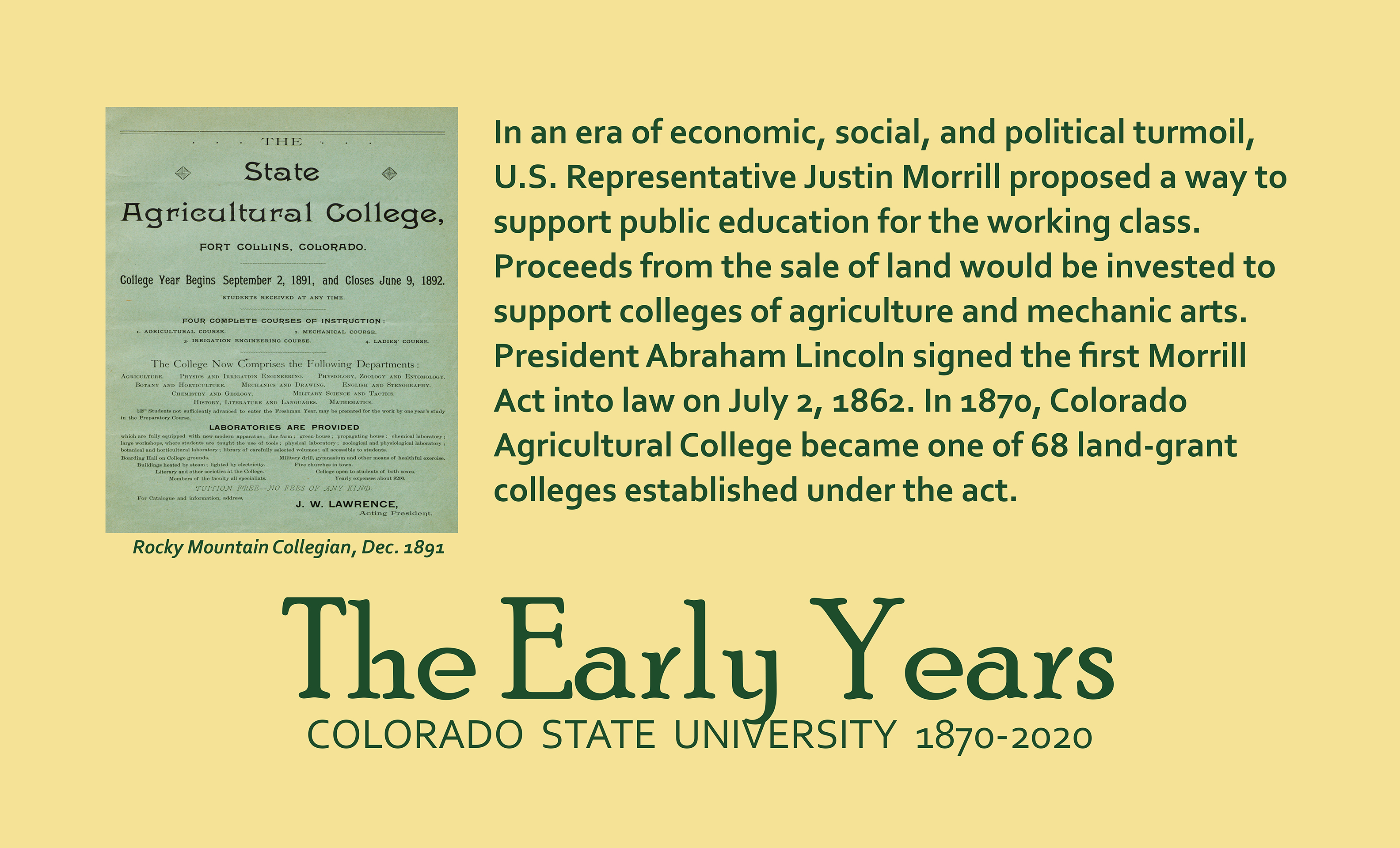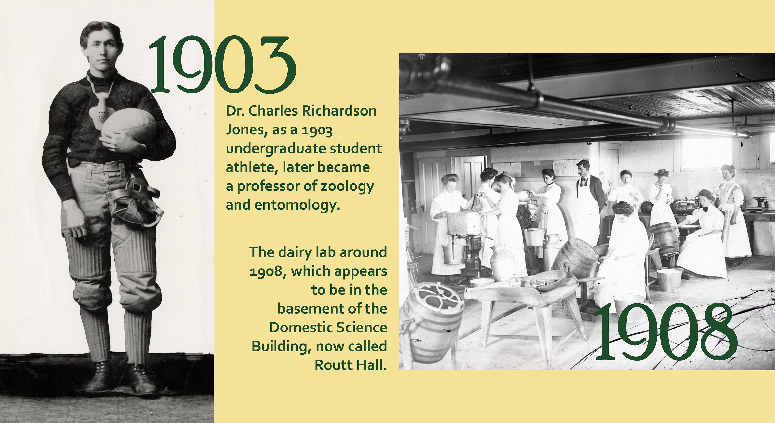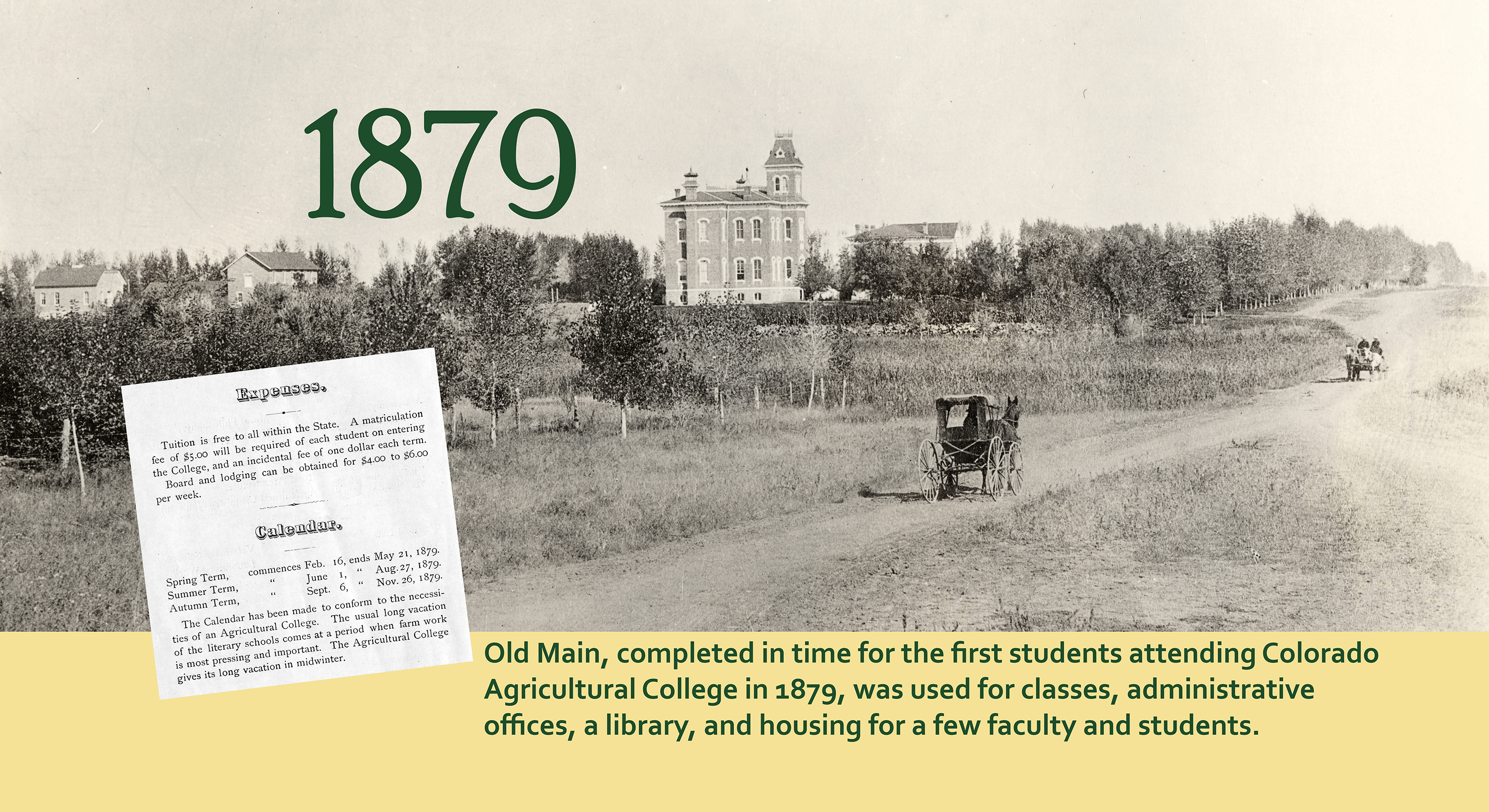 Display items from the first of four exhibit cases depicting the student experience at Colorado State University. The exhibit is associated with the university's 150th anniversary celebration in 2020. Focusing on the early years, included are images of Old Main in 1879; the first graduating class shown in 1884 and at a 50-year reunion in 1934; Dr. Charles Richardson Jones in 1903 as a student athlete; and a dairy lab class in 1908. A summary is given of the university's establishment in 1870 as a land-grant institution.